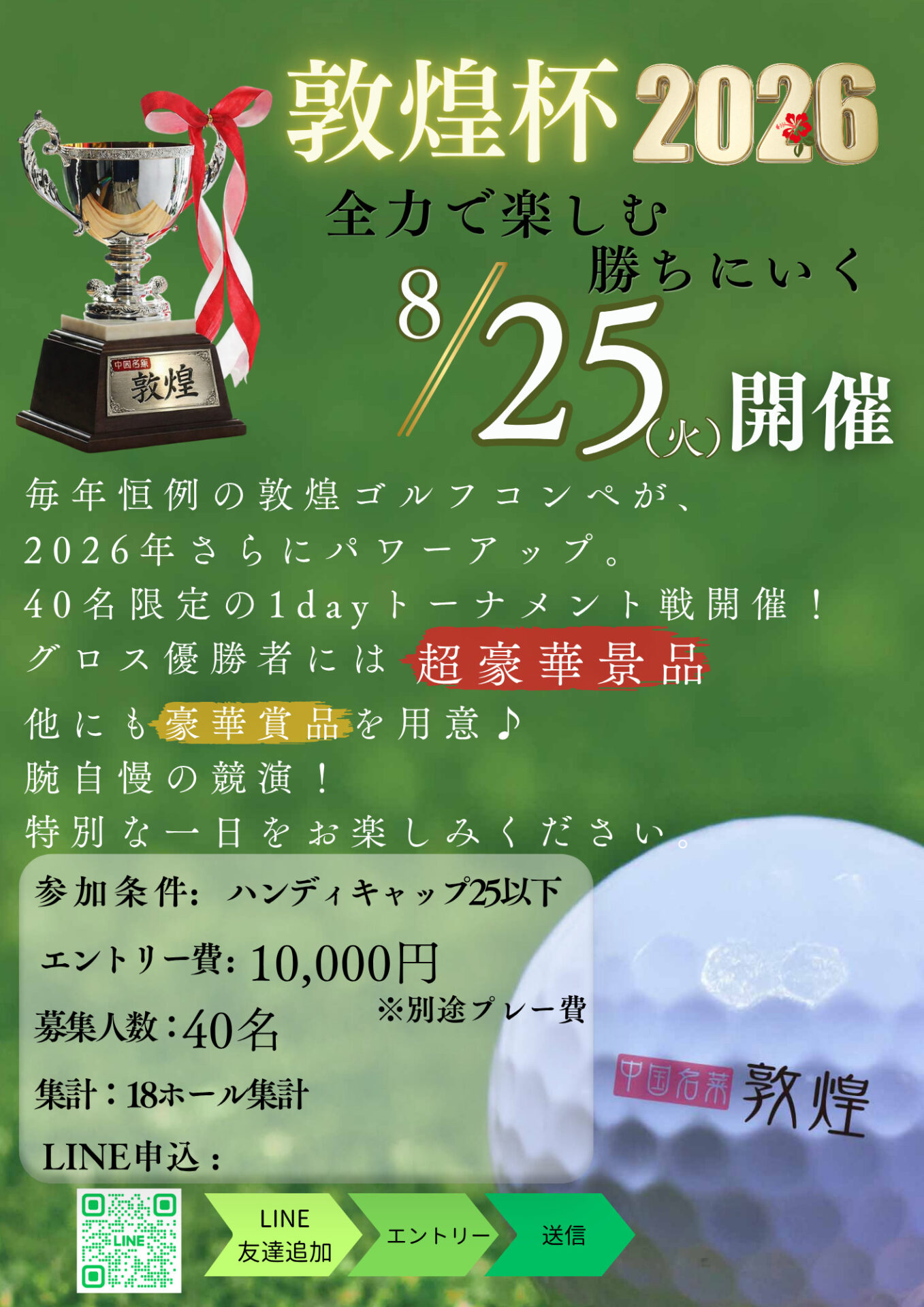 毎年恒例の敦煌ゴルフコンペが、2026年さらにパワーアップ。40名限定の1デイトーナメント戦開催!腕自慢集まれ!グロス優勝者には、超豪華賞品をご用意しました。誰もが主役になれる特別な一日をお楽しみください。